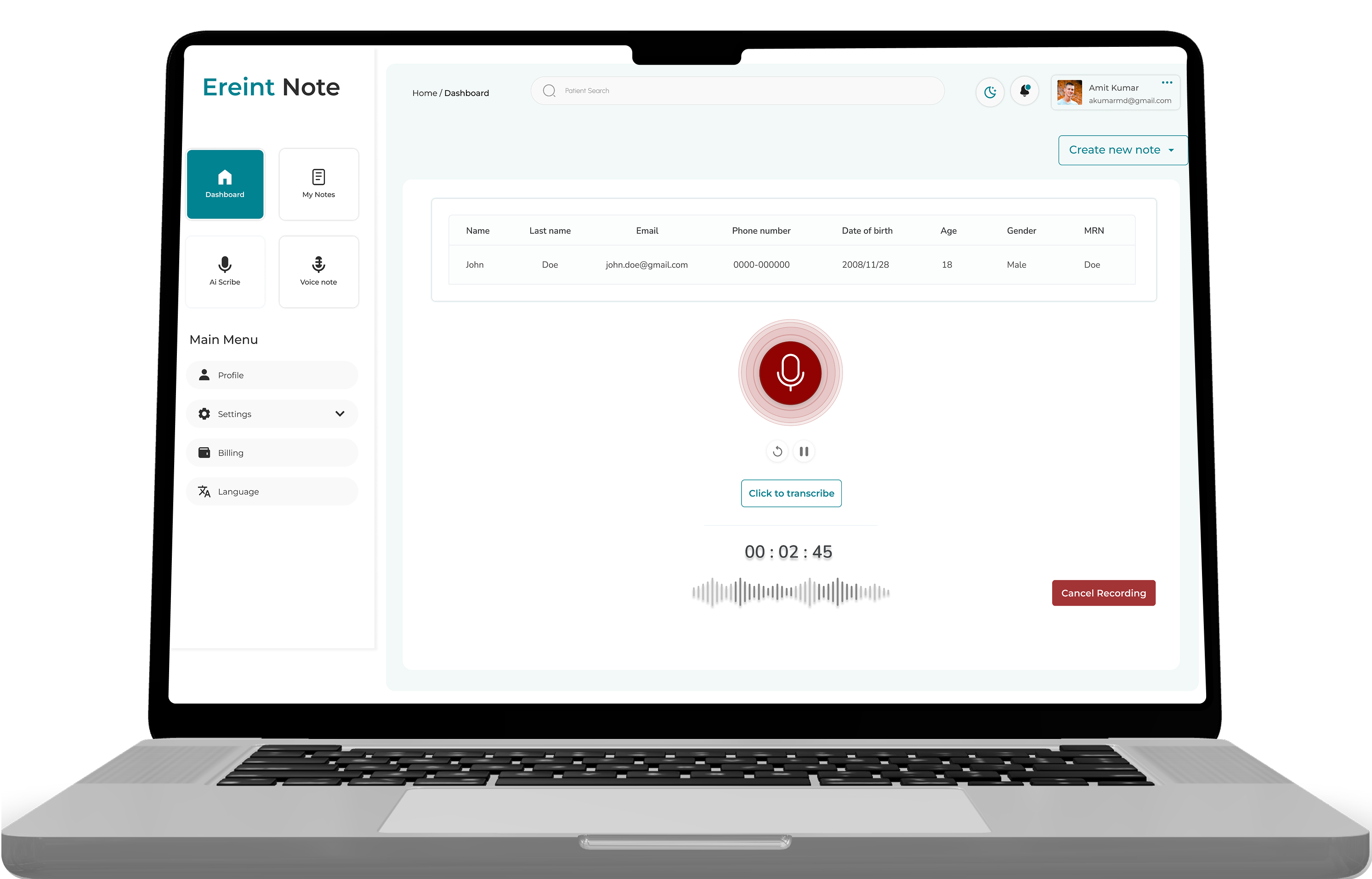 Ereint turns your voice into complete, accurate clinical notes within seconds. Powered by AI, it removes the need for manual typing, speeds up documentation, and helps you focus more on your patients, not the paperwork.
